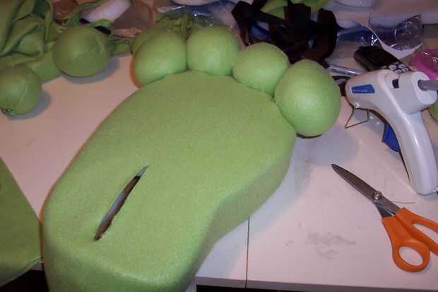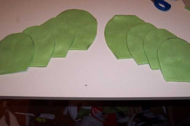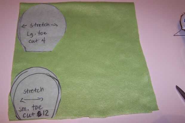 Cuando usted decide el tamaño de los dedos del pie pone su patrón hacia fuera en su paño grueso y suave para el tramo atraviesa los dedos del pie) y trace una línea alrededor de él. (Usted necesitará 4 recortes de dedo del pie grande y 12 cortes de dedo del pie pequeño (siempre puede doblarse la tela y hacer menos corte)! Esto es si quieres 4 dedos en cada pie que puede tener tantos dedos como usted quiera claro! (cuadro 1)