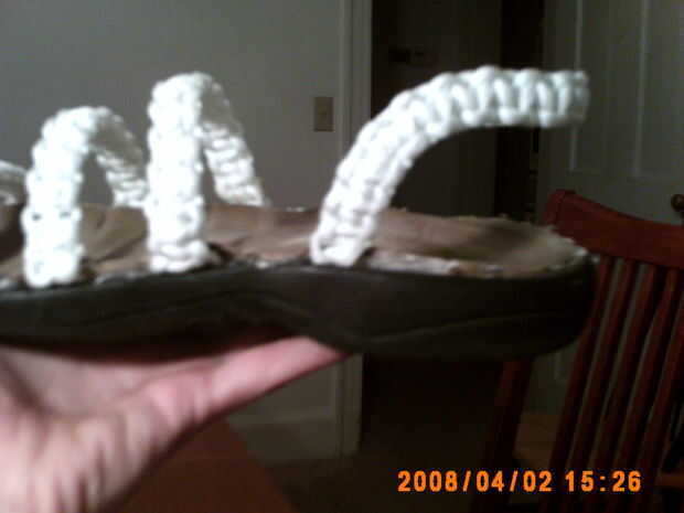 El título de este paso lo dice todo. Aquí es un hecho rápido. La cantidad de pegamento utilizas será directamente proporcional a cuánto dura el zapato. No va fácil aquí. Lo hice en mi primer intento, ver en la imagen, y la plantilla se cayó hacia fuera en un día de caminata casual. El segundo intento implicó un pegamento caliente más caro y un montón de él. Tal vez funcionaría un epoxi o silicona, pero no he probado.