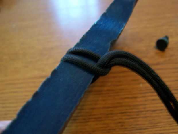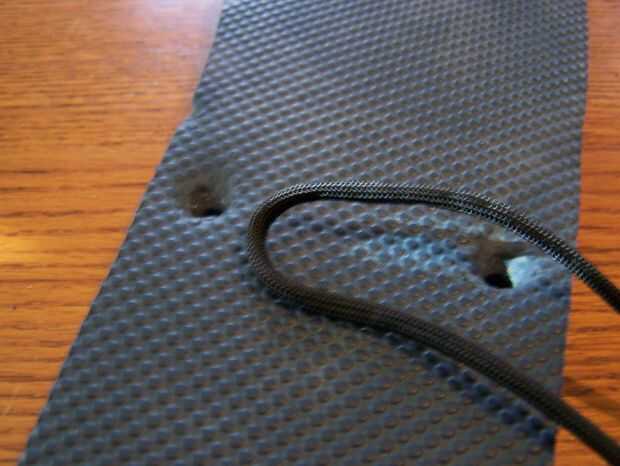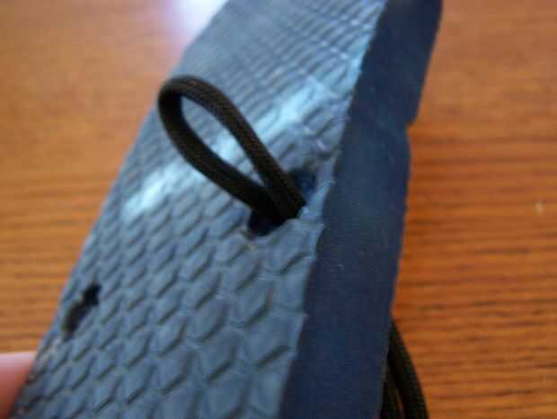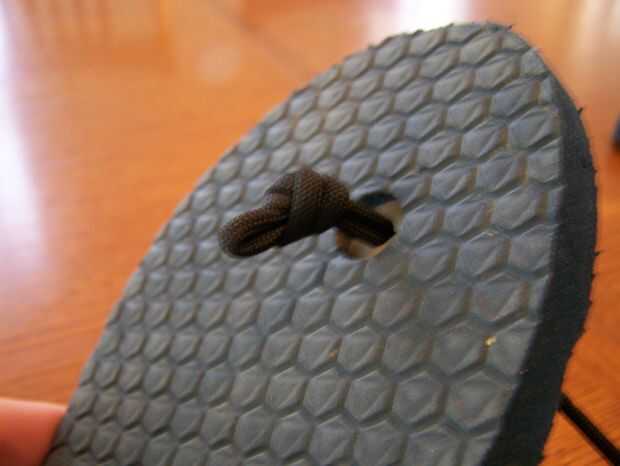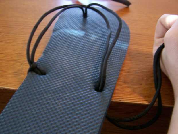 Empezar por retirar la correa original de plástico incómoda empujando las piezas de goma de gran diámetro fuera de la parte inferior y cortar con el cuchillo de bolsillo. Algunos serán más difíciles que otros. No tire el plástico, pero medirlo en su lugar y cortar una cantidad apropiada de Paracord más algunos, cerca de dos pies de este tiempo. No corte nunca demasiado poco. Dóblalo a la mitad y lanzó uno de los dos orificios en la parte posterior, siguiendo el cuadro como una guía de hilo. Llevar adelante ambos tramos y asegúrese de que están debidamente proporcionados a la correa de plástico original. Cuando llegue al frente, tomar una pizca de la cuerda de abajo y fuerza a través del agujero del dedo del pie. Un nudo en la parte inferior y seguir las fotos de una guía. Asegúrese de que el cable que va entre los dedos es suficiente. Mantener proporcional. A partir de ahí, ATA por el otro orificio en la parte posterior. Otra vez, la proporción a la cinta original es clave.