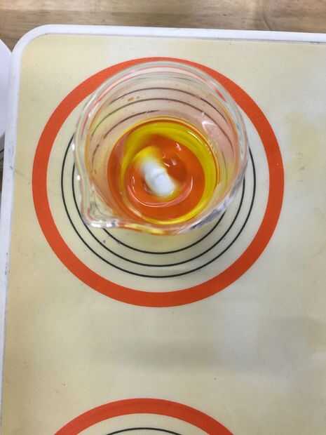 Ahora es el momento para remover la cera en el aceite. En la foto de arriba, estoy usando una placa de agitación magnética, pero mezclar a mano funciona igual de bien! Si tu tienes problemas de mezcla en la cera, trate de calentarlo otra vez unos minutos más.