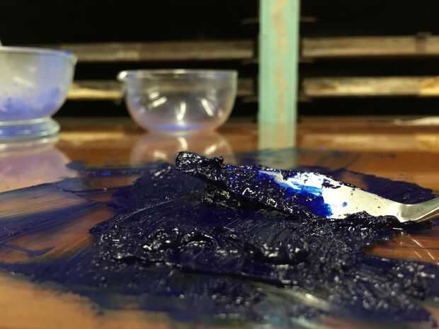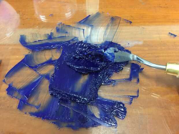Ahora, vamos a combinar poco a poco el pigmento y el aceite de linaza. Es útil mezclar el pigmento doblando sobre sí misma utilizando el cuchillo de paleta. Seguir mezclando hasta que el pigmento se humedece (extraña palabra, ya sé) y ya no ves todo el polvo seco en la mezcla. El resultado final debe ser una pasta espesa y grumosa, que nosotros podemos dejar de lado por ahora.