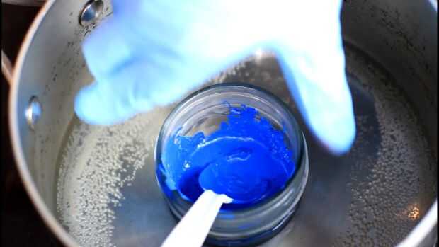 Ahora iniciar una olla de agua con aproximadamente una pulgada de agua, poco a poco empezar a hervir. Agregar el jar y asegúrese de que el agua no hirviendo porque quieres no hay agua en el producto. Revolver constantemente hasta que la cera se disuelve completamente y combina la pintura y la cera. Repetir con tus otros tarros.