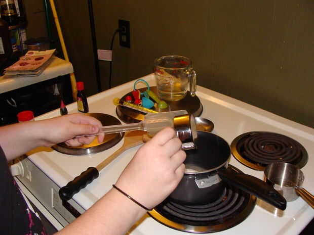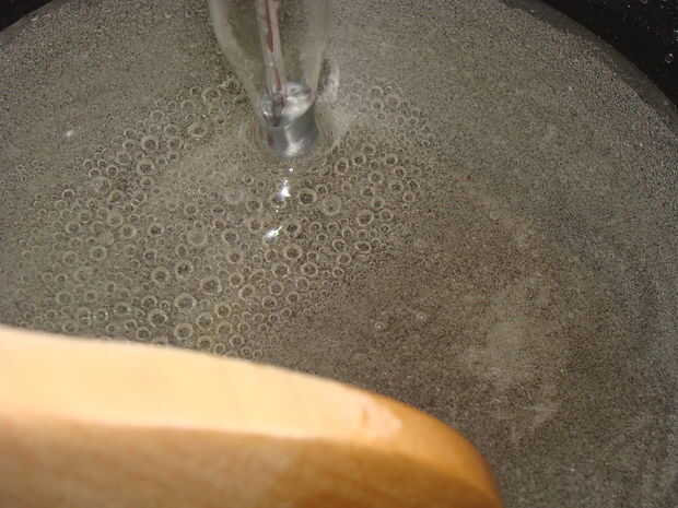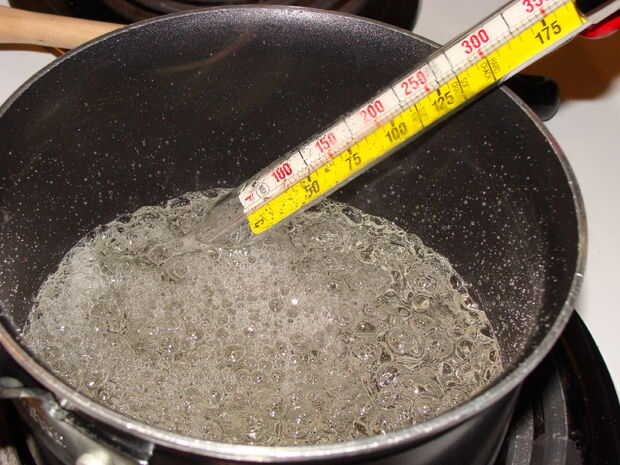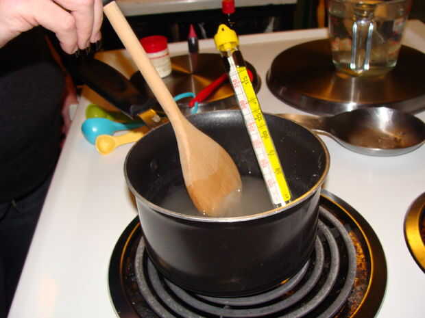 4 cuando la mezcla comience a hervir deje de agitación y coloque el termómetro de caramelo a la mezcla hirvienda (no deje que el termómetro toque el fondo o las paredes)