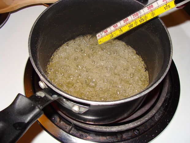 5 una vez que el termómetro Lee 300 grados o caramelos crack inmediatamente retire la olla de la estufa y deje enfriar a 275 grados