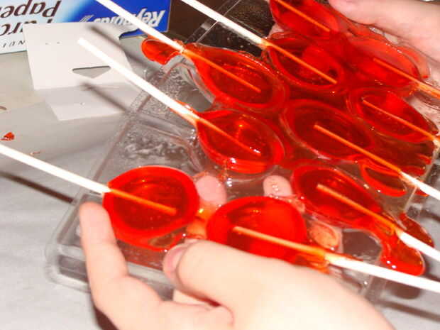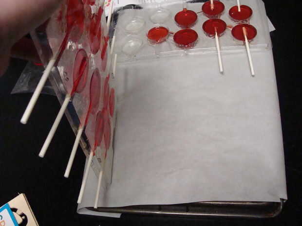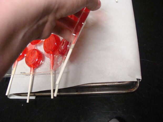 2 agarrar ambos extremos del molde y curva o a la sacudida hasta que todas las piruletas se caen