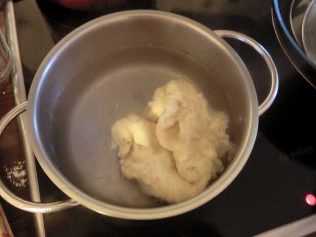 Gota 2 o 3 rosquillas en el agua durante unos 45 segundos, voltear los bagels después de 22 segundos. Durante este tiempo, se debe precalentar el horno a 350 grados. Después de que el bagel se ha cocinado, escurrirlo y colocarlo en una hojas para hornear engrasada.