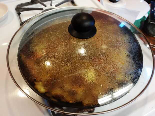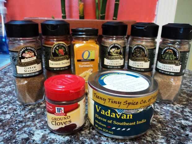 Entonces agregué mis especias. Usé 1/2 cucharadita de cada uno de cardamomo, comino, coriandro y clavo de olor, 1 cucharada de mezcla de especias de vadavan (disponible en Amazon) y garam masala (más sabroso si lo haces a ti mismo) y 1 cucharadita de pimentón y cúrcuma. Mezclarlas en las cebollas y dejar cocinar durante 30 minutos. Después de 30 minutos, cubierta con una tapa, menor calor abajo a bajo y cocine por 20 minutos antes de transferirlas a un bol. No lave la cacerola aún!