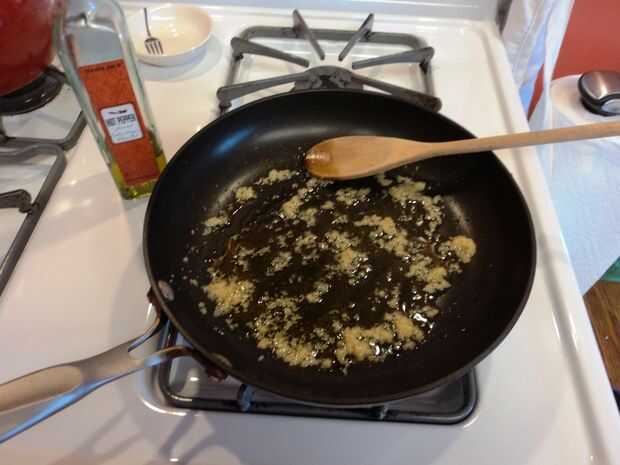 En primer lugar, calienta guindilla aceite de oliva y unos ajos a fuego medio-bajo. Una vez que caliente, añadí dos cebollas picadas - uno blanco grande y uno pequeño rojo, diversidad de sabor.