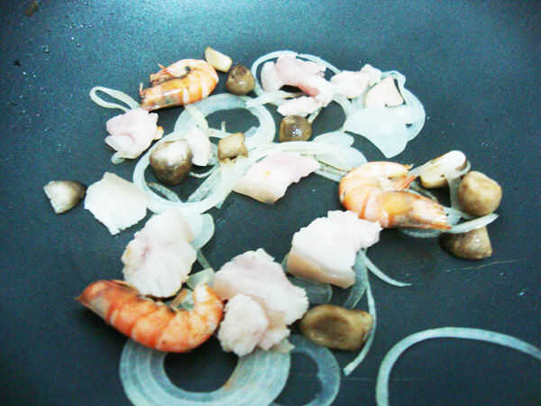 Paso 7: Precaliente la cacerola vierta unas gotas de aceite en cubierto uniformemente, camarones, carne, seta, cebolla, precios en la isla.