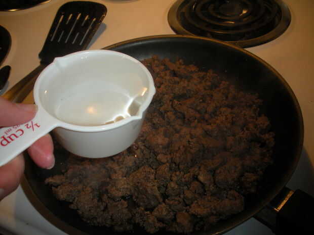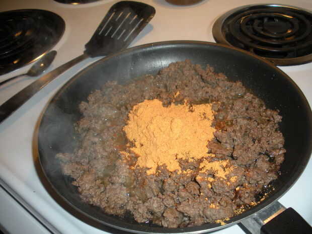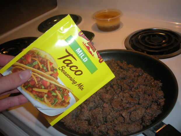 Agregar el paquete de condimentos mexicanos y 1/2 taza de agua a la carne de vacuno. La mezcla y continúe batiendo mientras hierve a fuego lento. Permiten la carne a fuego lento durante unos 15 minutos o hasta que la mayoría de la humedad ha impregnado en la carne. Continuar mezclando la carne de vacuno durante los 15 minutos con el fin de evitar que se queme.