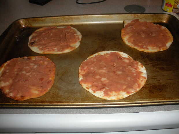 Abierto una lata de frijoles refritos. Extensión 2 cucharadas de frijoles refritos a un lado de la cáscara de cada tortilla.