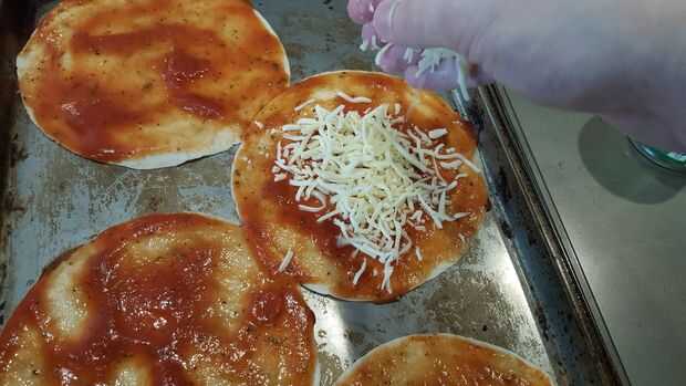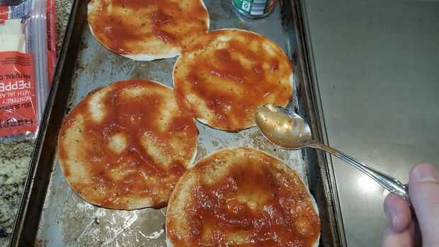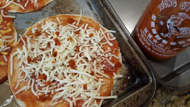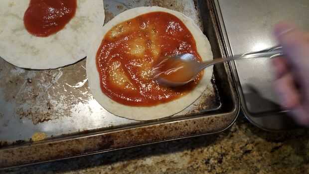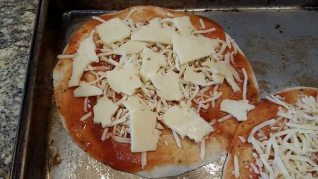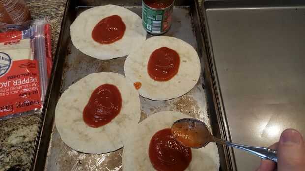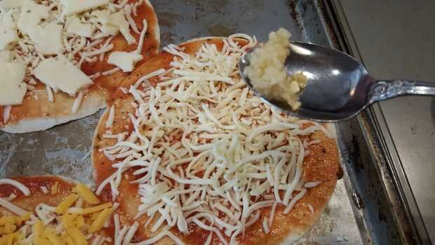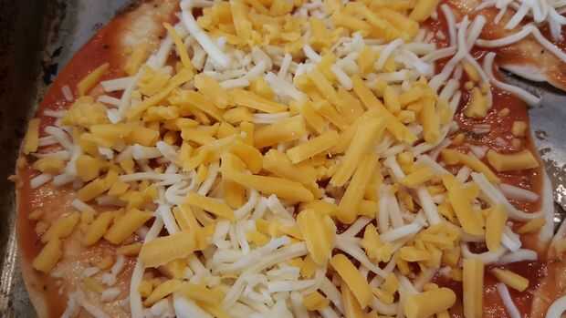 Si tienes estas tortillas de taco pequeño, use 2-3 cucharadas de la salsa y repartidos por toda la superficie. Luego agarra un puño lleno de queso y espolvorea uniformemente sobre la pizza. El ajo es totalmente innecesario pero quería algunos.