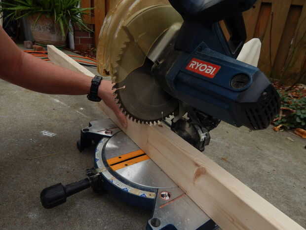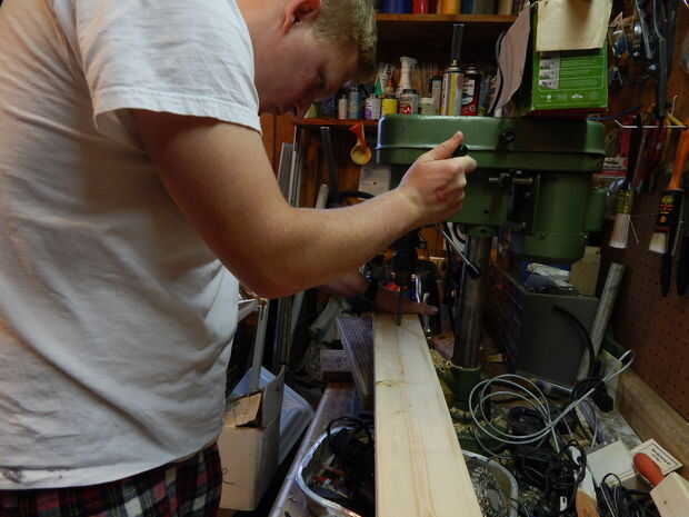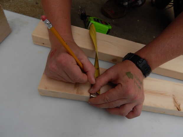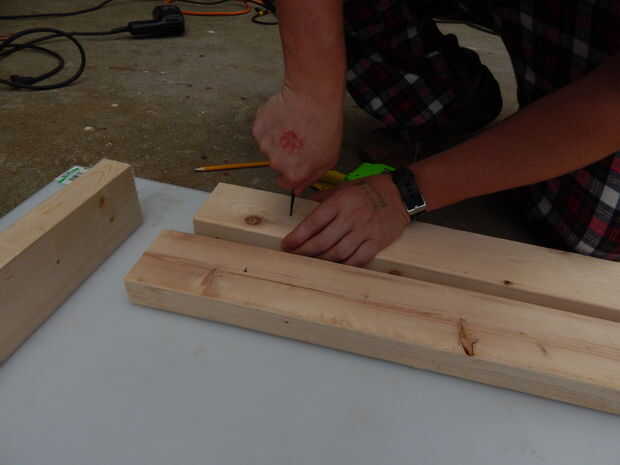 En un extremo de cada pieza, miden de 4-1/2 pulgadas desde el extremo de la tabla y haga una marca. Miden 1-3/4 pulgadas desde el borde del tablero a la marca que acaba de hacer, hacer una segunda marca. En la intersección de las marcas, su punzón y una pequeña hendidura en la madera. A continuación, usando un taladro o taladro y una broca de 5/16, perfore a través de la muesca. Estos agujeros se utilizará para sostener sobre las piernas.