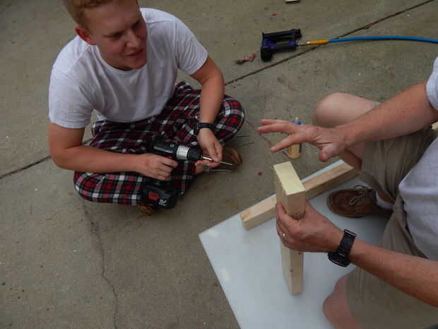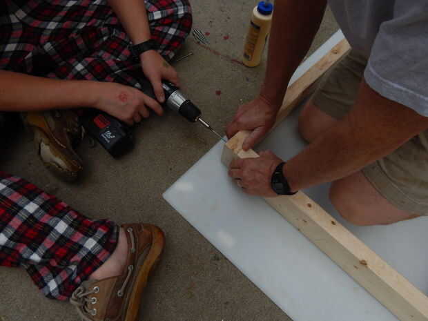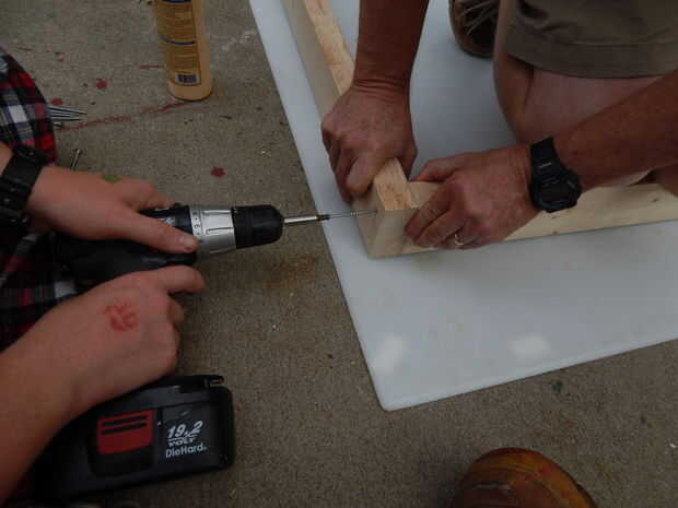 Para armar el marco, puede que necesite una mano extra o dos.  Esta persona se alinean las piezas con las piezas laterales y asegúrese de que queden al ras, mientras que la otra persona utiliza los tornillos para sujetar las partes a los extremos.