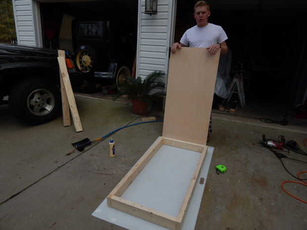 Ahora todas las piezas están listas.  Todo laico de las piezas hacia abajo en la forma del marco.  Poner pegamento de madera en los extremos de las placas de extremo.  Asegúrese que los agujeros de la pierna en los tableros laterales son en el mismo fin y que los lados de los tableros con los orificios avellanados son hacia fuera.
