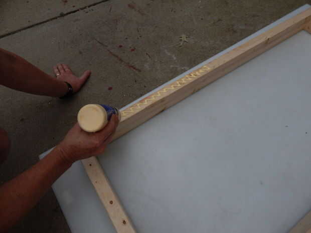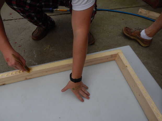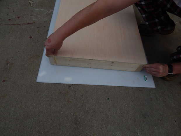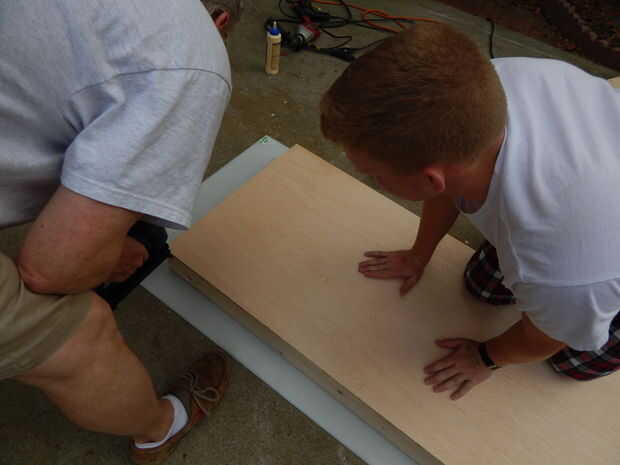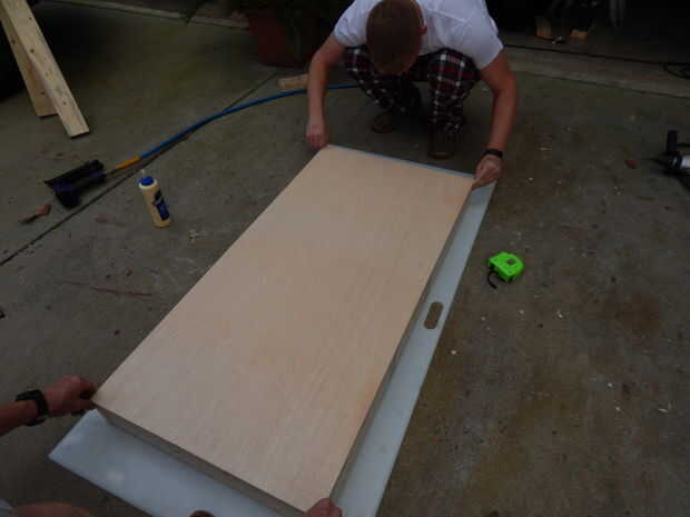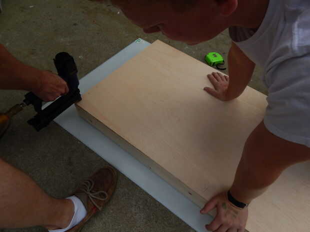Coloque la hoja de madera contrachapada sobre el marco para que encaje. Si lo hace, tomar fuera de la estructura y línea de la parte superior del marco con pegamento de madera, utilizando una brocha para igualar el pegamento. Coloque la hoja de madera contrachapada en el marco y asegúrese de que quede centrado. Presionar la hoja sobre el marco para comprimir el pegamento. Use la clavadora para sujetar la madera a la estructura, dejando alrededor de 6 pulgadas entre cada brad. Tenga cuidado mantenga al clavador recta hacia arriba y hacia abajo para que no clavitos sobresalen de la parte de la estructura. Si cualquiera de los clavitos se sobresale de la madera, les golpee con un martillo.