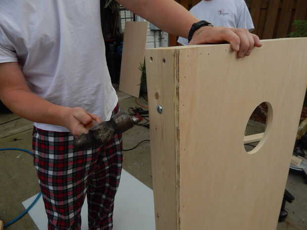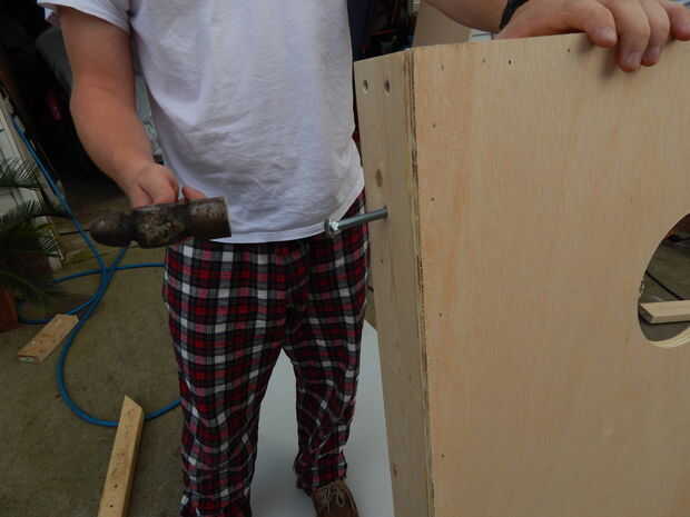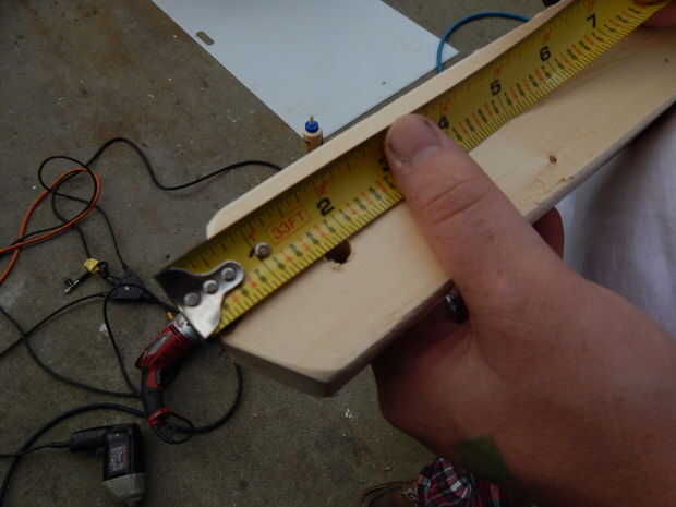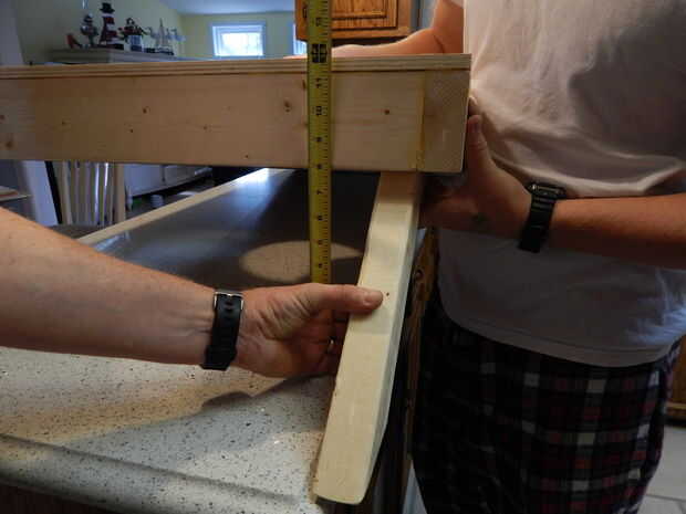 El siguiente paso es un poco más complicado. Aquí, usted tendrá una larga y plana mesa o encimera. Afiance el tablero de 2 x 3 que se corta justo al bastidor utilizando el tornillo de la pata. Poner la Junta de atento en el contador, colgar el tablero de 2 x 3 en el lado de la cubierta como se muestra en el cuadro 7. Juego de manos es útil aquí. Asegurándose de que la cubierta de la Junta es exactamente 12" en el contador, utilice el contador como una regla para marcar una línea en la pierna. Corte a lo largo de esta línea con su sierra. Hacer otra pierna para el otro lado y se establecerá.