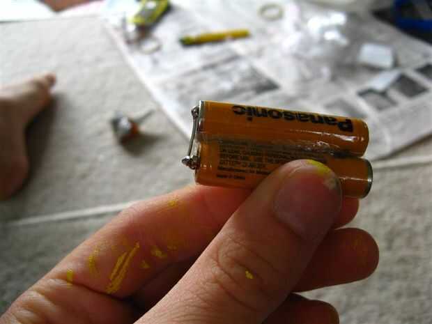 La próxima cosa a soldar es las baterías. Antes de soldar, sin embargo, las dos baterías deben ser grabadas juntos, lado a lado. Asegúrese de que las baterías están orientadas para que cada extremo tiene un positivo y un terminal negativo - es decir, debe orientarse la primera batería - +, mientras que el otro debe ser uno + -.