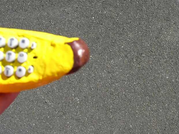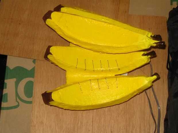 Cuando hayas hecho esto... Estás todavía no terminado. El trabajo final es el cuarto plátano vacío sobre la base del pegamento. Deben colocarse por lo que está sentado sobre el banano de centro y el plátano de la izquierda. Pegamento caliente funciona bien para esto.