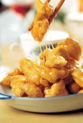 La dosificación del aceite en el azúcar (azúcar y aceite proporción de 50 gramos de azúcar) en 15 gramos de aceite, la temperatura del aceite no es demasiado alta, el azúcar derretida lentamente revuelva con una cuchara, jarabe de la dorada es la luz amarilla, teniendo la seda del azúcar, que es frito pedazo de plátano, el sirope, lejos del fuego, rápido tirón , jarabe envuelto en material de plátano freír uniformemente, puede ser en la placa, colocar sobre el consumo de alambre rojo y verde melón.