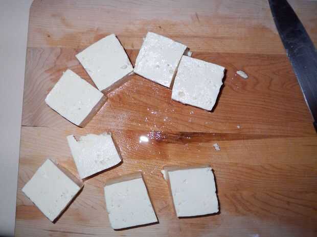 Si usas queso de soja, picarla para arriba en pedazos grandes. Si utilizas seitán, sólo tirada.