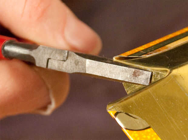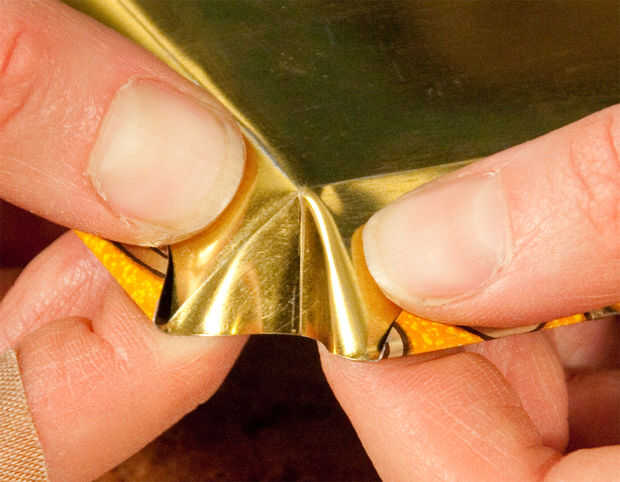 La siguiente cosa a hacer es conseguir las esquinas iniciadas. Solo doblarlas con los dedos en la misma dirección que usted anotó les. No trate de doblarlos demasiado. Al mismo tiempo, un poco doble los lados hacia arriba un poco, otra vez, no demasiado lejos. No todas las esquinas de esta manera. Si las esquinas no están afiladas, puede utilizar unos alicates de punta plana para afilar, como se muestra en la segunda foto aquí. La pieza debe parecerse a la tercera foto en este momento.