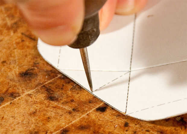 Con su punzón, se marcan los extremos exteriores de las líneas poco de 45° en las esquinas. Esto es solo para que puedas ver la marca del otro lado.