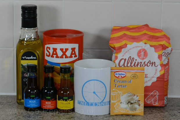 Esta es nuestra luz a Shrek!Lo primero que se necesita para crear esta asombrosa luz de Shrek es real casera Play-Doh.Estos son los materiales que necesitará para empezar a hacer la masa de colores,Pasta conductorataza de agua1 taza de harina 3/4 taz