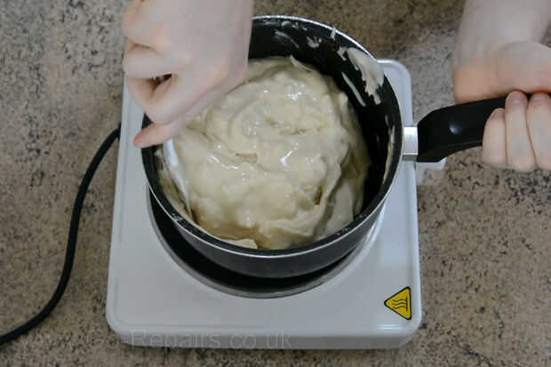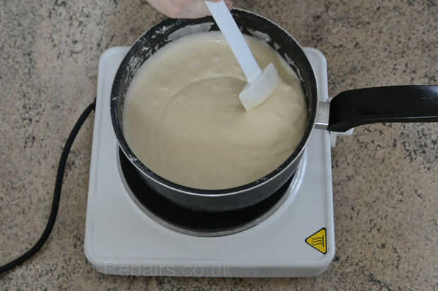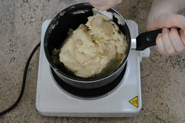 Una vez que tengas una mezcla suave encender la calefacción y una temperatura baja. Continuar revolviendo, tu mezcla está lista cuando todo viene de los lados de la cacerola en un bulto grande. Si está pegajosa al tacto entonces dejarlo en unos minutos más. Cuando esté listo usted necesita tomar fuera del calor y deje que se enfríe.