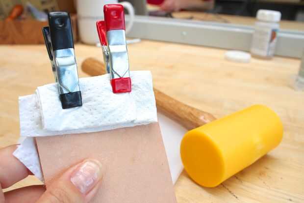 Doble una toalla de papel y doble sobre el borde humedecido y luego fije con abrazaderas. Esto absorber exceso de humedad y evitar daños en el cuero las abrazaderas.
