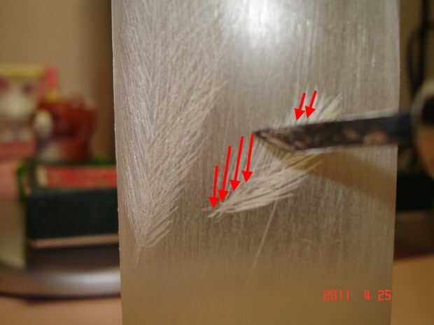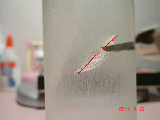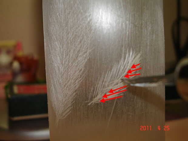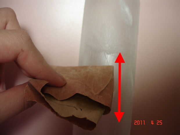 (1) papel de groundwood de uso para hacer una capa de la superficie de la botella. (2) Utilizando este tipo de cuchillo (según las fotos) para crear plumas (según las fotos). (3) Usando groundwood papel para hacer una capa de la superficie de la botella otra vez.