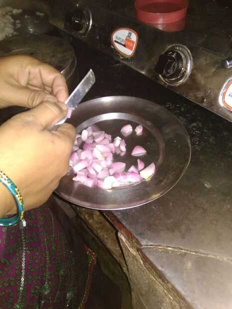 cortar algunas cebollas y coloque en el panel y también ahora mezcla las especias polvo de la cúrcuma y otras especias centeno