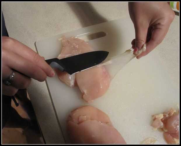 *Tip: Después de cortar, secar inmediatamente cada pechuga de pollo con una toalla de papel.