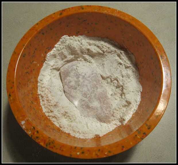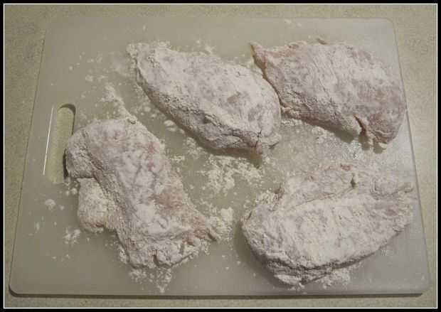 6. rastra (capa) de pechugas de pollo en la mezcla de harina uno a la vez.