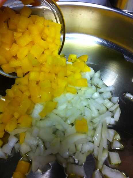 A fuego medio, agregar las cebollas y pimientos a la sartén. Revolver bien, cocinar por cinco minutos.