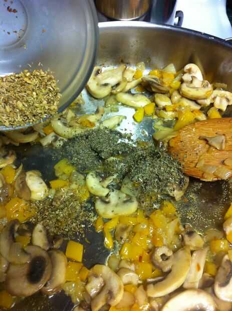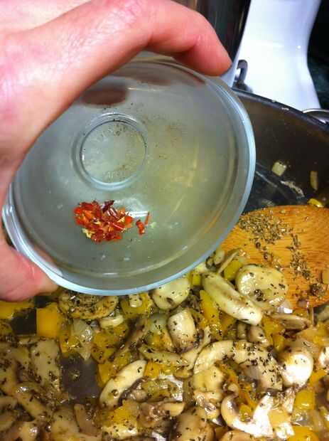 Agregar la albahaca, orégano y por causa de piedad, asegúrese de añadir los copos de pimiento rojo.