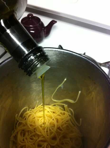 Una vez terminada los espaguetis, drenaje, mezclar bien con un poco más de aceite de oliva y servir inmediatamente