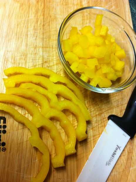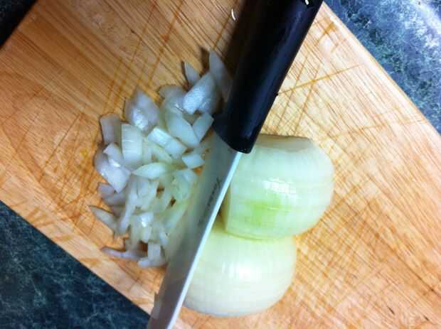 Picar la cebolla. Mismas reglas aplican. Dados como grande o tan pequeño como usted desea.