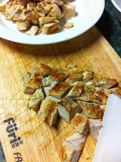Por ahora, el pollo es fresco probablemente bastante para manejar. Cortar en cubos y apartar. Cubra con una toalla de papel húmeda para evitar que se sequen.