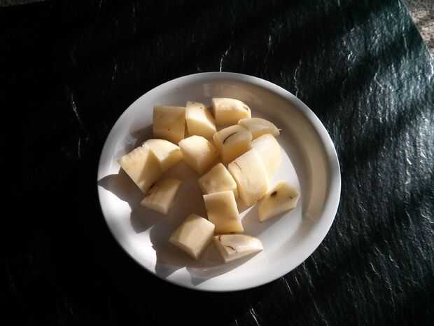 • A continuación, pelar la piel de la patata y cortar en media. Luego corte cada mitad en ocho trozos pequeños. En total tienes 16 patatas pequeñas, corte uniformemente.