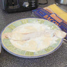 Tomar una tira de tocino y liberalmente capa en harina, asegurando que toda la pieza está cubierta.