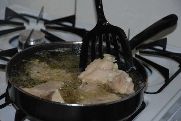 Después de unos 5 minutos más se hará el pollo. Parece blanco a ligeramente marrón. Corte en el centro de uno de los pechos (se puede quitar desde el aceite para hacerlo). Como el centro es blanco y no rosa, se hace el pollo.