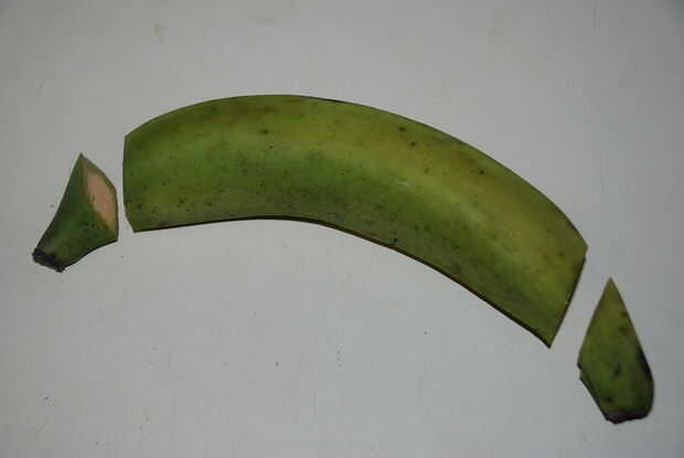 Cortar los extremos de plátano similar a cómo eliminas los extremos de un plátano.  Hacer lo cortes apx. 1 a 1,5 en cada extremo.  Cortar completamente a través de plátano y desechar los extremos.