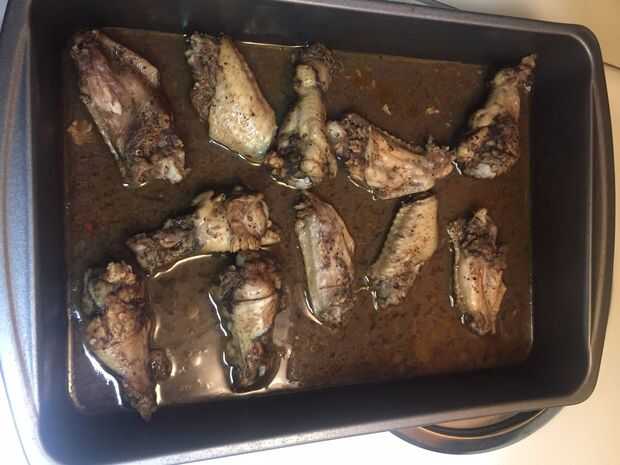 Después de 30 minutos el pollo debería estar listo. Retire la bandeja del horno e inspeccione el pollo. Si es marrón y la carne se caiga el hueso está listo para comer. Si no es de color marrón puede poner en el horno durante 10 minutos y compruebe otra vez.