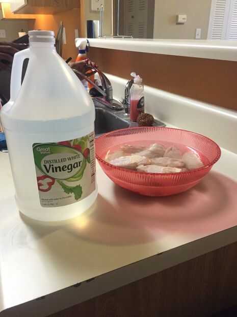 Intentar volcar tanto del agua, en el recipiente, como puede así que hay apenas cualquier izquierda junto con el pollo. Puede también utilizar otro bol y simplemente coloque el pollo del recipiente de descongelación para el tazón de fuente nueva. Ahora Limpie el pollo con 1/2 taza de vinagre blanco y 1 taza de agua que se mezclan en el recipiente. Dejar el pollo reposar de 3 a 5 minutos. Esto será deshacerse de los gérmenes y bacterias en el pollo.