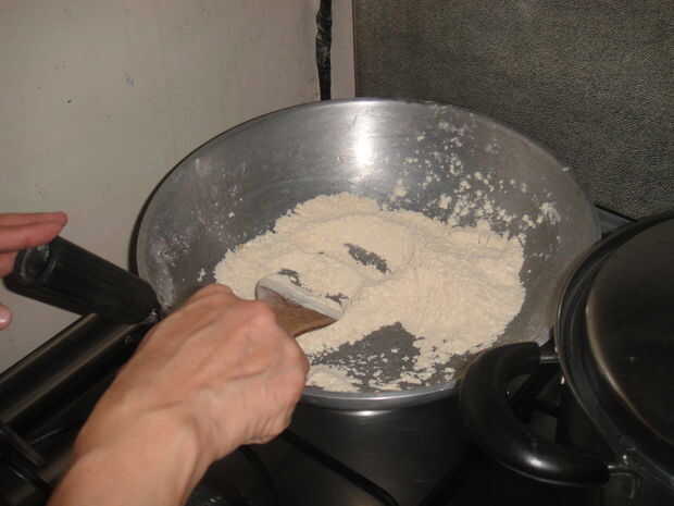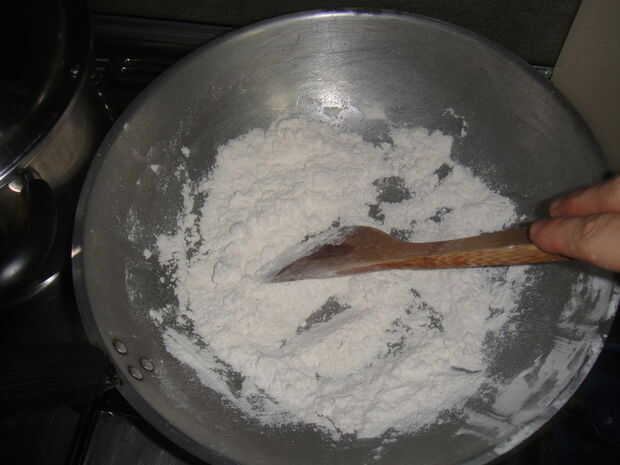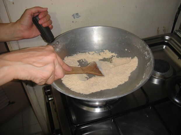 poner la harina a la sartén y tueste hasta marrón claro. No lo deje solo tostar en fuego abierto.