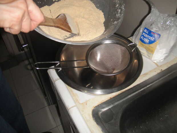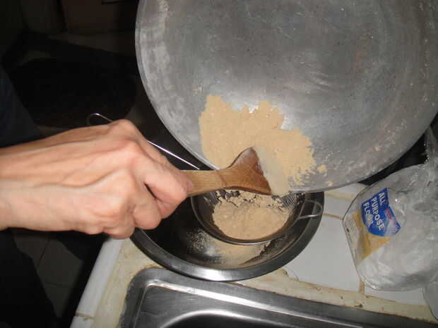 Primero colar la harina para hacer la harina suave sin grandes objetos entonces