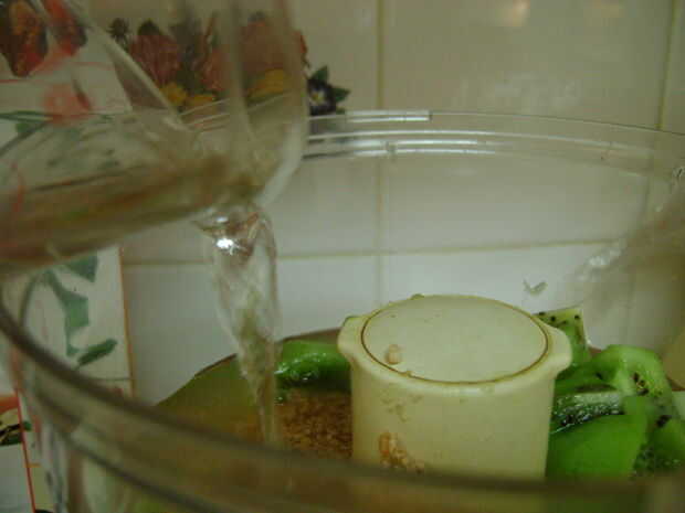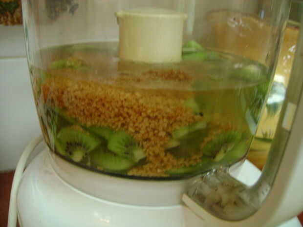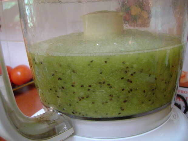 Poner los kiwis, zumo de 2 limones, 1/2 taza de azúcar y 1 taza de agua en el procesador y puré lo suficiente como para que hay no hay trozos de kiwi y azúcar.
