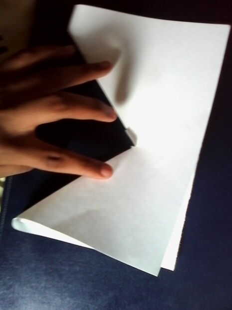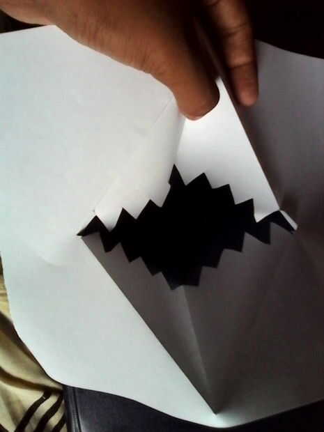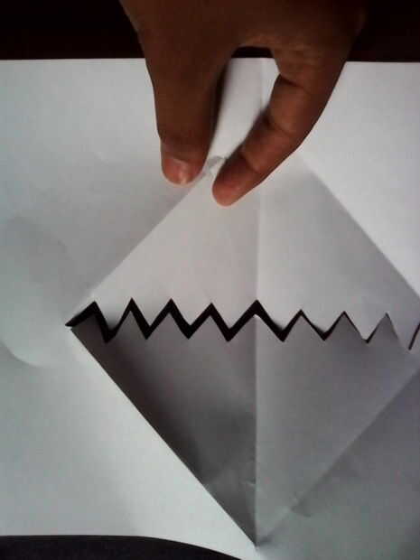 Está bien, luego utilizando el pulgar o los dedos, pasar el triángulo superior al interior y su pulgar o dedos, empuje con el triángulo inferior a través de en el interior también.
