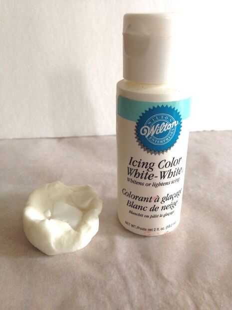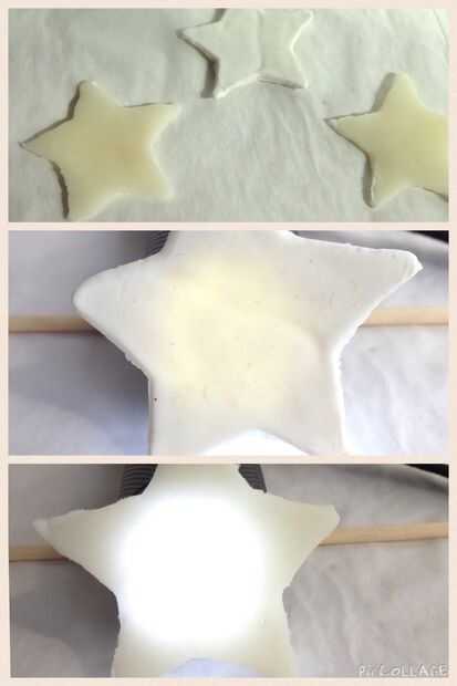 Opté por dejar de lado el blanco colorante al hacer este lote, pero añadí algunos a un pequeño trozo para demostrar la diferencia. La estrella en el centro de la imagen tiene el Wilton blanco blanco, los otros dos no. Se puede ver que los que no tienen una apariencia ligeramente amarillentas cuando secas y son mucho más translúcidos cuando una luz se brilla a través de ellos.